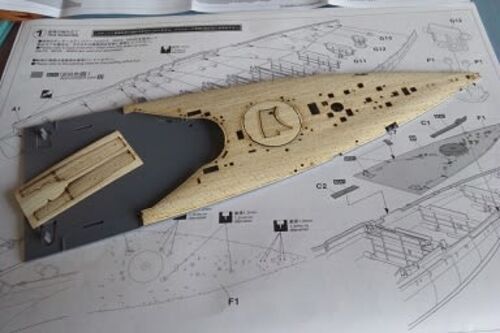 晴れ。奇跡のように晴れていたし、気温も零度以上あった様子。暖かかった。 午前中は模型を制作していた。塗装、マスキングが主。 よりリアリティを出すため、高かったが「木製甲板」なる別売りパーツを購入してみた。で、写真はあてがってみている状態。袋…