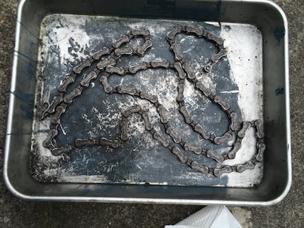 コレ。悲惨な有様です……。これは自転車のチェーンです。「いとも悲惨なるチェーン」です。見るも無残な有様で、パーツクリーナー一本消費しても綺麗になりませんでした。地道にブラシでゴミを掻き出して、今日の作業は完了となりました。